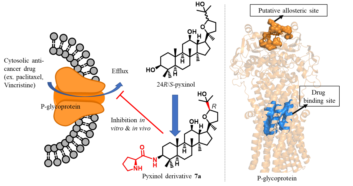 本团队以人参皂苷在人肝脏中的主要活性代谢产物——pyxinol为母核结构基础,以化员工物学和药物分子设计合成为主要研究方向,针对肿瘤多药耐药的P-糖蛋白靶点,构建了系列高活性抑制剂,并利用P-糖蛋白N端的潜在变构位点进行虚拟筛选,然后在蛋白分子水平、细胞水平及动物进行了确证。该研究将有力引导并推动P-糖蛋白非底物型变构抑制剂的研究与开发,为新型肿瘤多药耐药逆转剂的发现,提供了一种全新的策略。