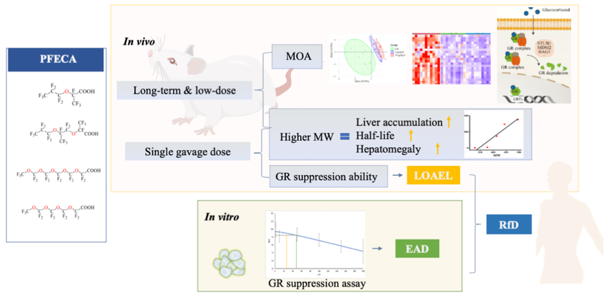 全氟和多氟烷基物质(PFAS)是一类应用极广泛的化学物质,其生物蓄积性和潜在的健康危害属全世界范围内广受关注的科学问题。PFECA被认为是传统PFAS的新型替代品,具有好的推广应用前景,但当前科学界对PFECA的体内药物代谢动力学(PK)规律和健康风险的认识非常有限。在本工作中,研究人员发现分子量是决定不同PFECA化合物血清半衰期的关键因素。PFECA除了具有过氧化物酶体增殖物激活受体(PPAR)激动效应,导致β-氧化增强、脂肪酸降低等代谢改变外;长期低剂量PFECA暴露动物的肝脏细胞应激信号受到广泛抑制,进一步的分子机制探究发现PFECA主要通过增强糖皮质激素受体(GR)的降解抑制了该信号途径,进而广泛损害下游的应激信号,这一效应在传统PFAS中未见报道。研究人员进而通过PK与体外体内外推(IVIVE)模型相结合,比较了PFECA动物暴露与体外细胞检测中GR抑制效应的基准剂量(BMD),提出了基于GR抑制效应的PFECA参考剂量(RfD)。