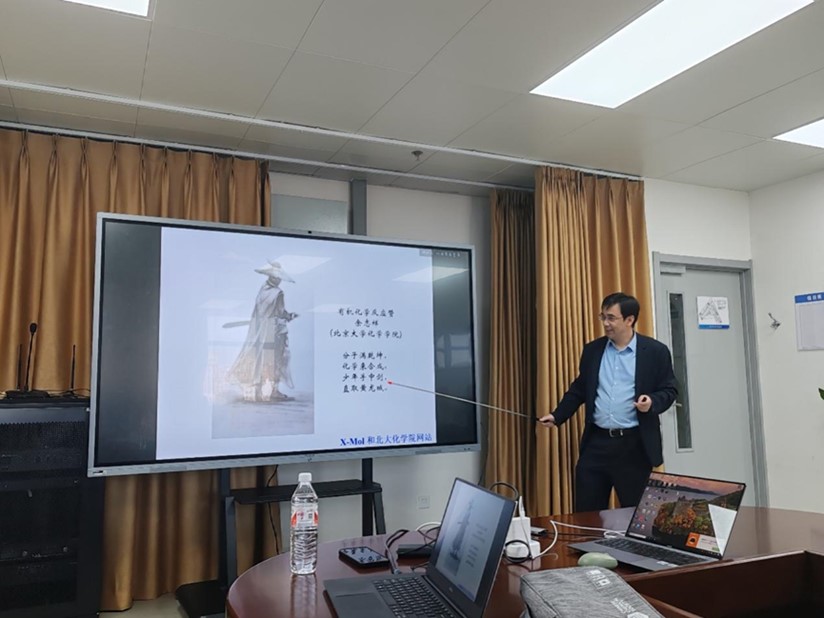 报告会上,现场的老师与员工就有关成环反应、天然产物合成、药物合成中的问题与余志祥教授进行了交流和讨论,现场学术氛围浓厚热烈。最后,余教授将“千沟万流虽辛苦,吹尽狂沙始到金”这句古典名句赠与在场各位科研人,并鼓励各位烟大青年教师和学子坚持理想,脚踏实地,立志报效祖国。